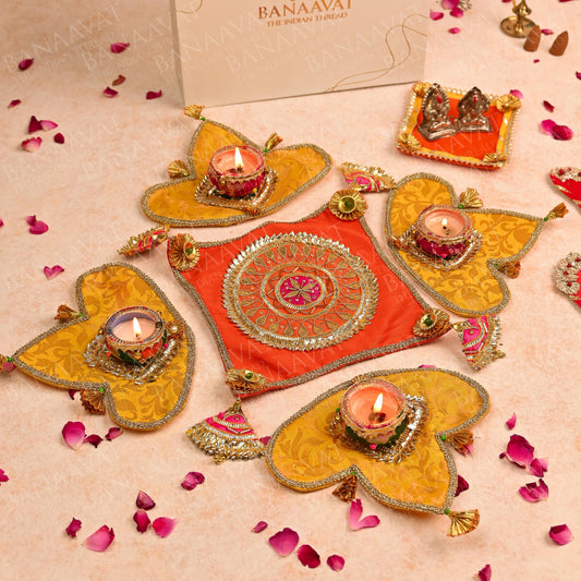 4-Piece Handcrafted Fabric Center Rangoli with Diya Set – Eco-Friendly & Reusable Décor