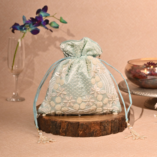 Banaavat Essence Muslin Silk Potli – White Bead & Pearl Embellished (Pastel Blue, Red & Yellow)
