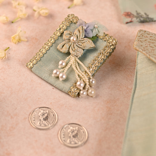 Introducing the Nilasha Collection, a charming combo set of three items in a serene pastel sky blue color. This collection includes a very mini ginni potli, a favor tissue potli, and a saree cover. Perfect for gifting the bride-to-be, newlyweds, mothers, mothers-in-law, and bridesmaids, the Nilasha Collection embodies subtle elegance and timeless beauty. Enhance your gift-giving experience with the delicate and soothing hues of the Nilasha Collection