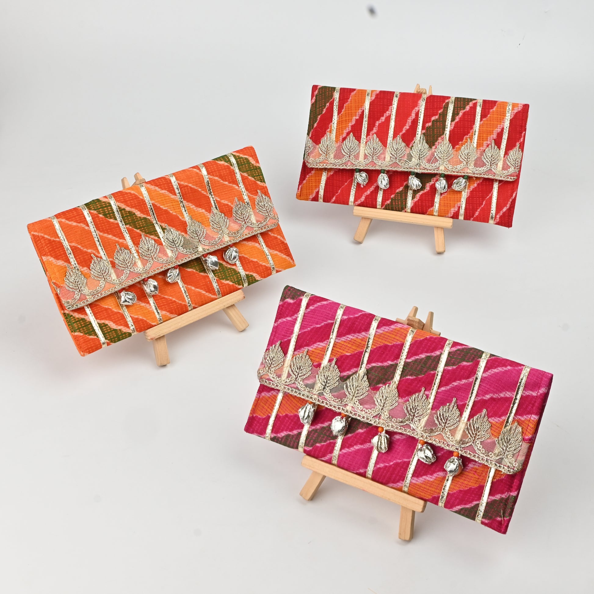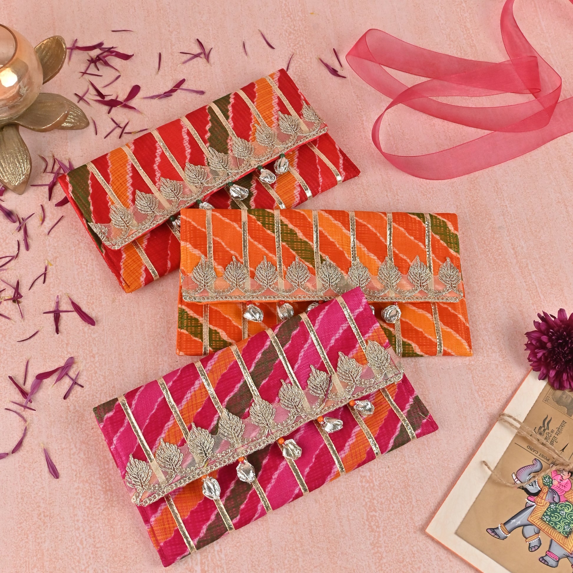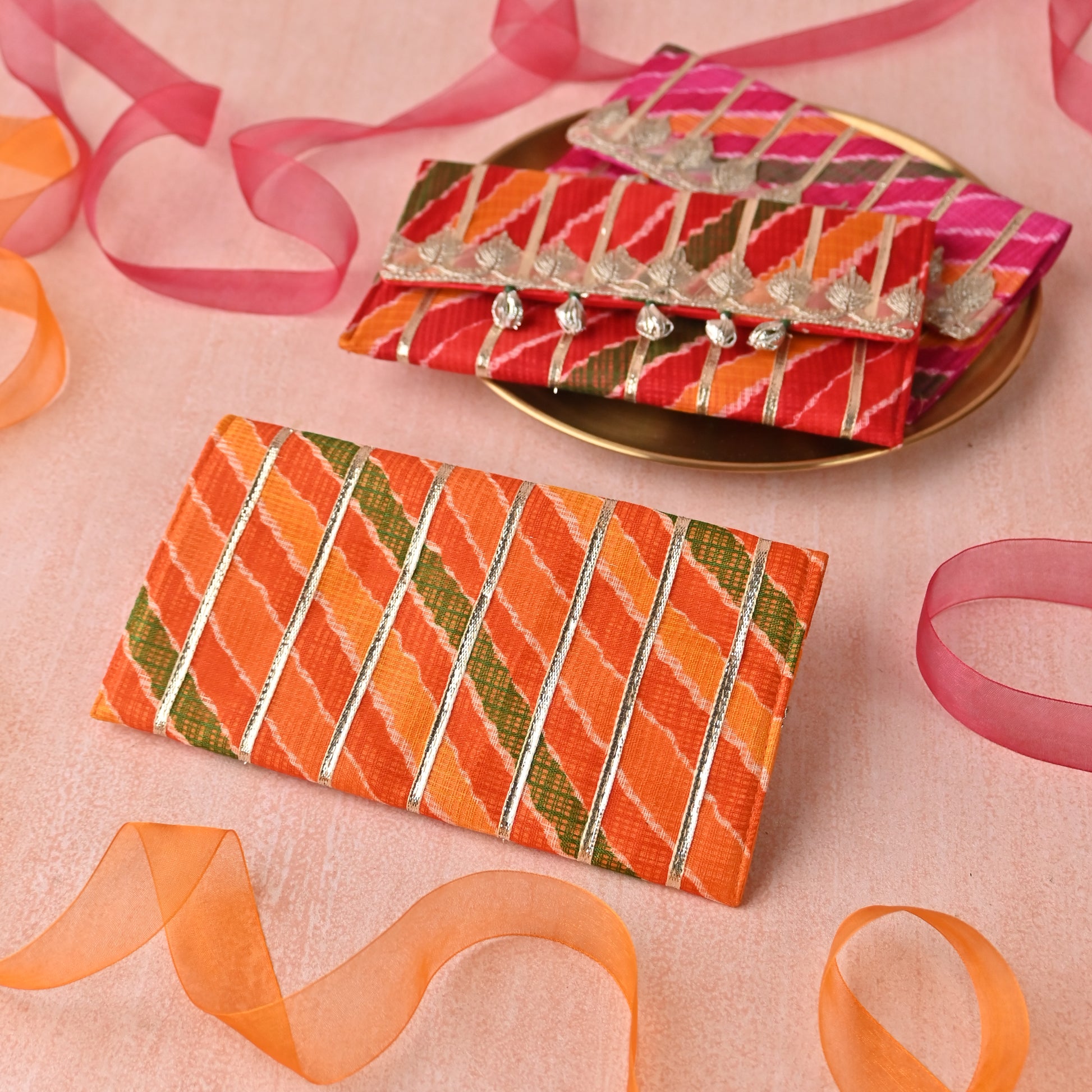 Product Description: Our Lehriya money envelopes with intricate gota lines are a perfect blend of timeless tradition and modern design. Handcrafted with premium Kota Doria fabric and reinforced with a 0.3-inch foam padding, these envelopes ensure durability and style—ideal for your shagun and gifting needs.