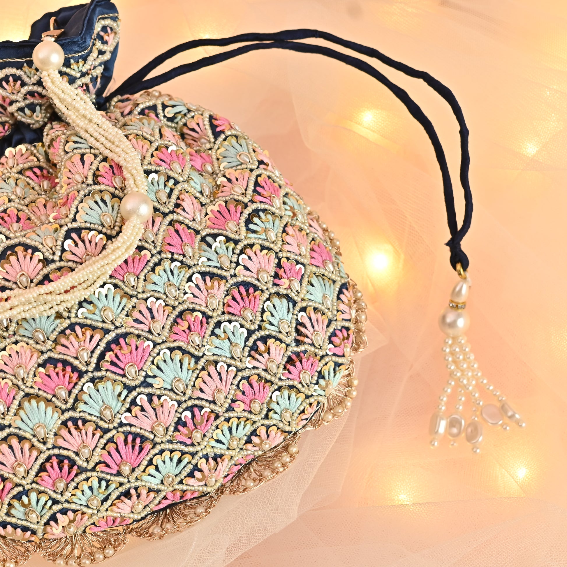 Banaavat Essence Navy Muslin Silk Potli – Multi-Color Thread Embroidery