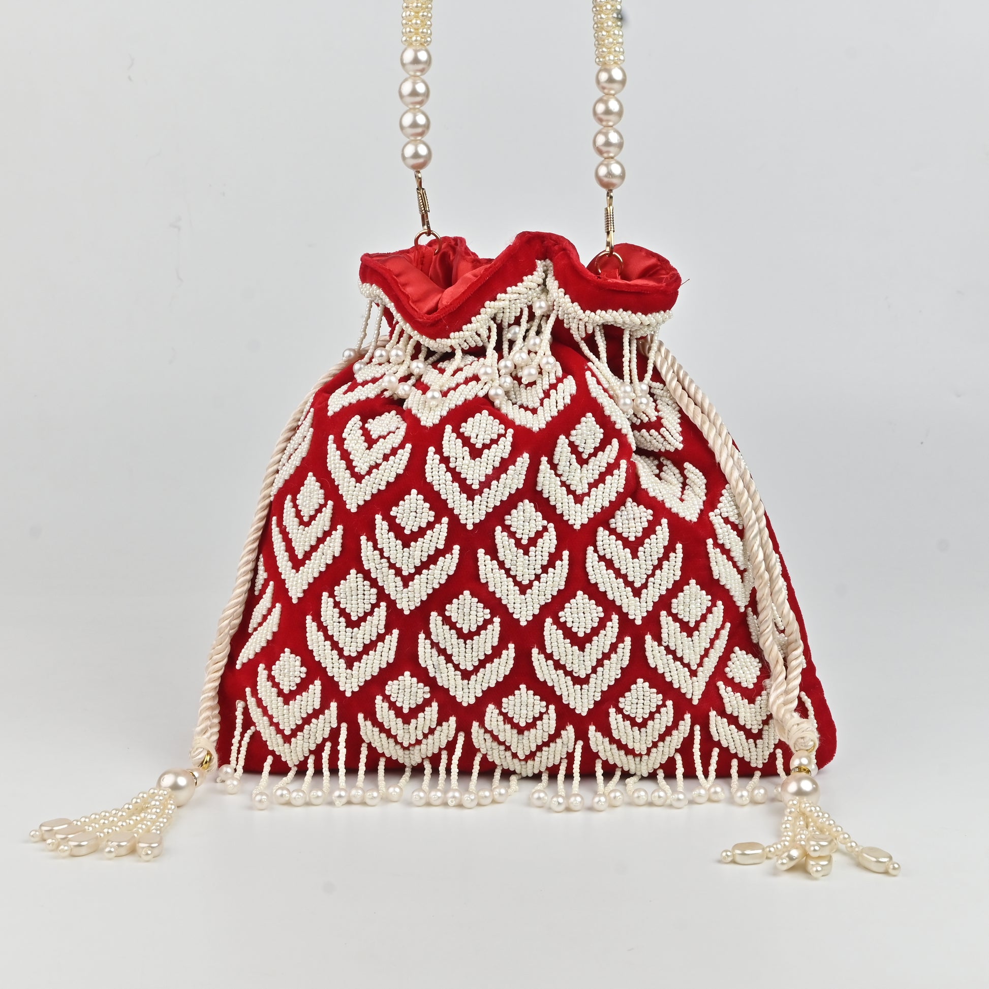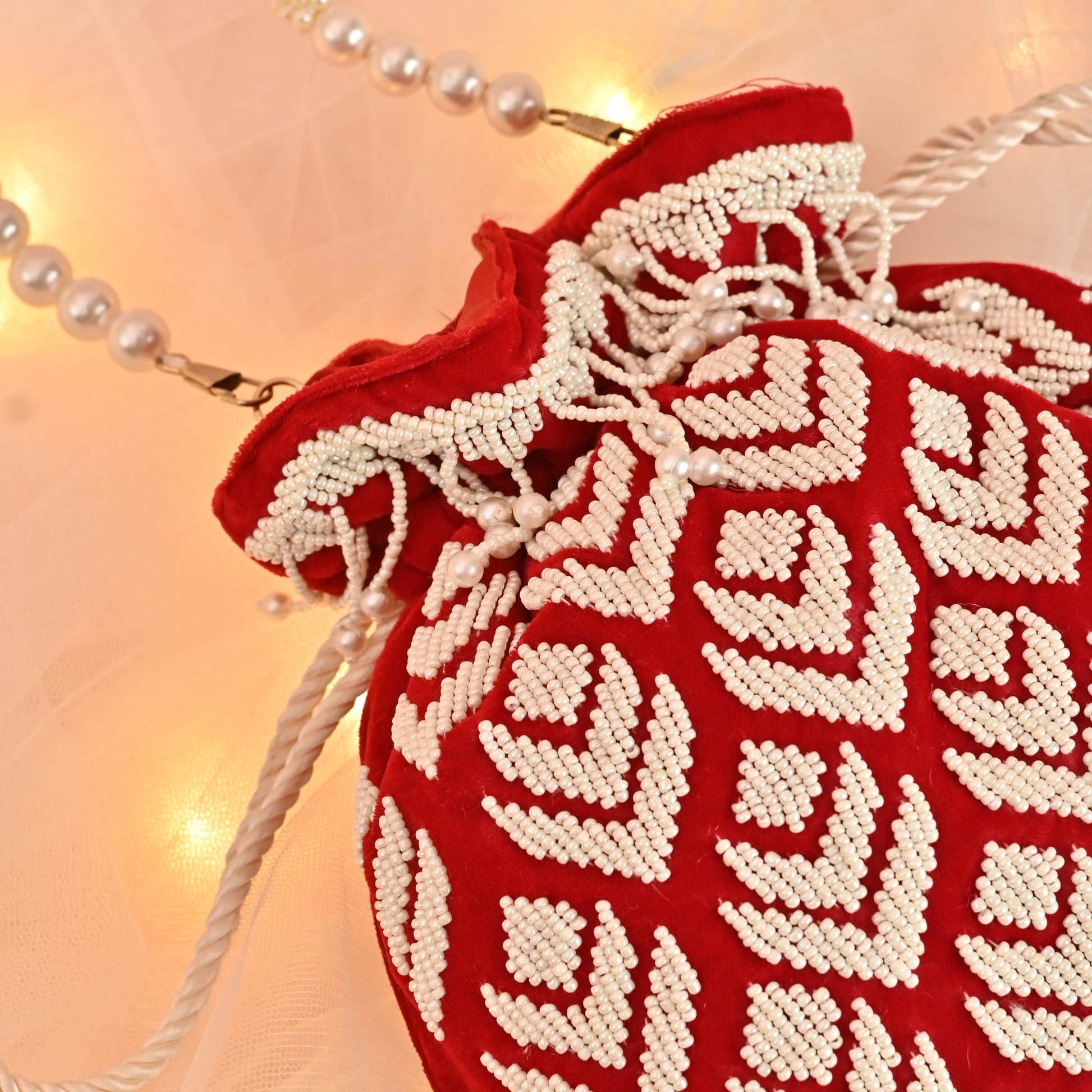 Banaavat Essence Red Velvet Potli – Pearl Barfi Detailing & Pearl Handle