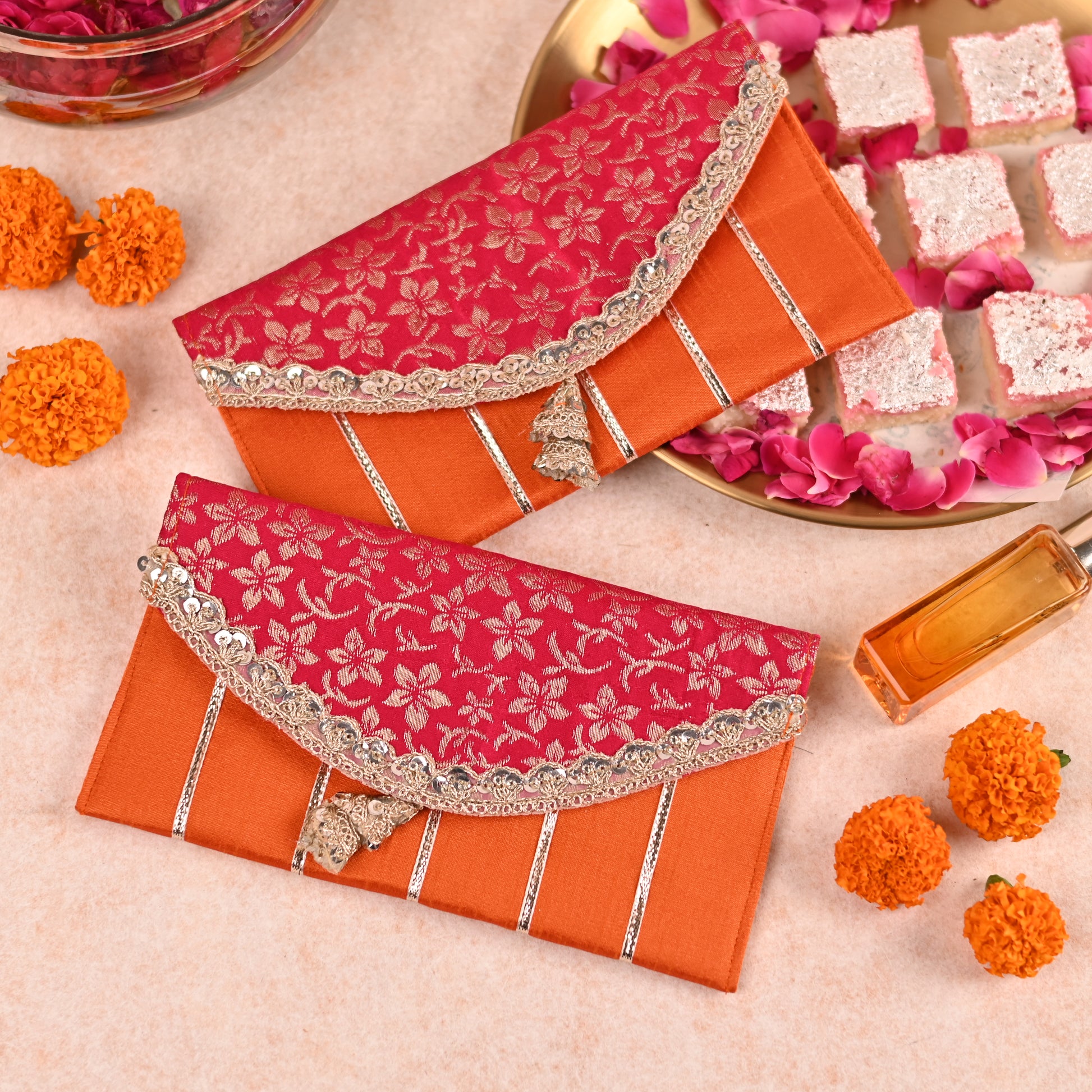 Vibrant hot pink and orange money envelope featuring a luxurious brocade flap. Perfect for gifting cash at weddings and adding a splash of color to your celebrations.