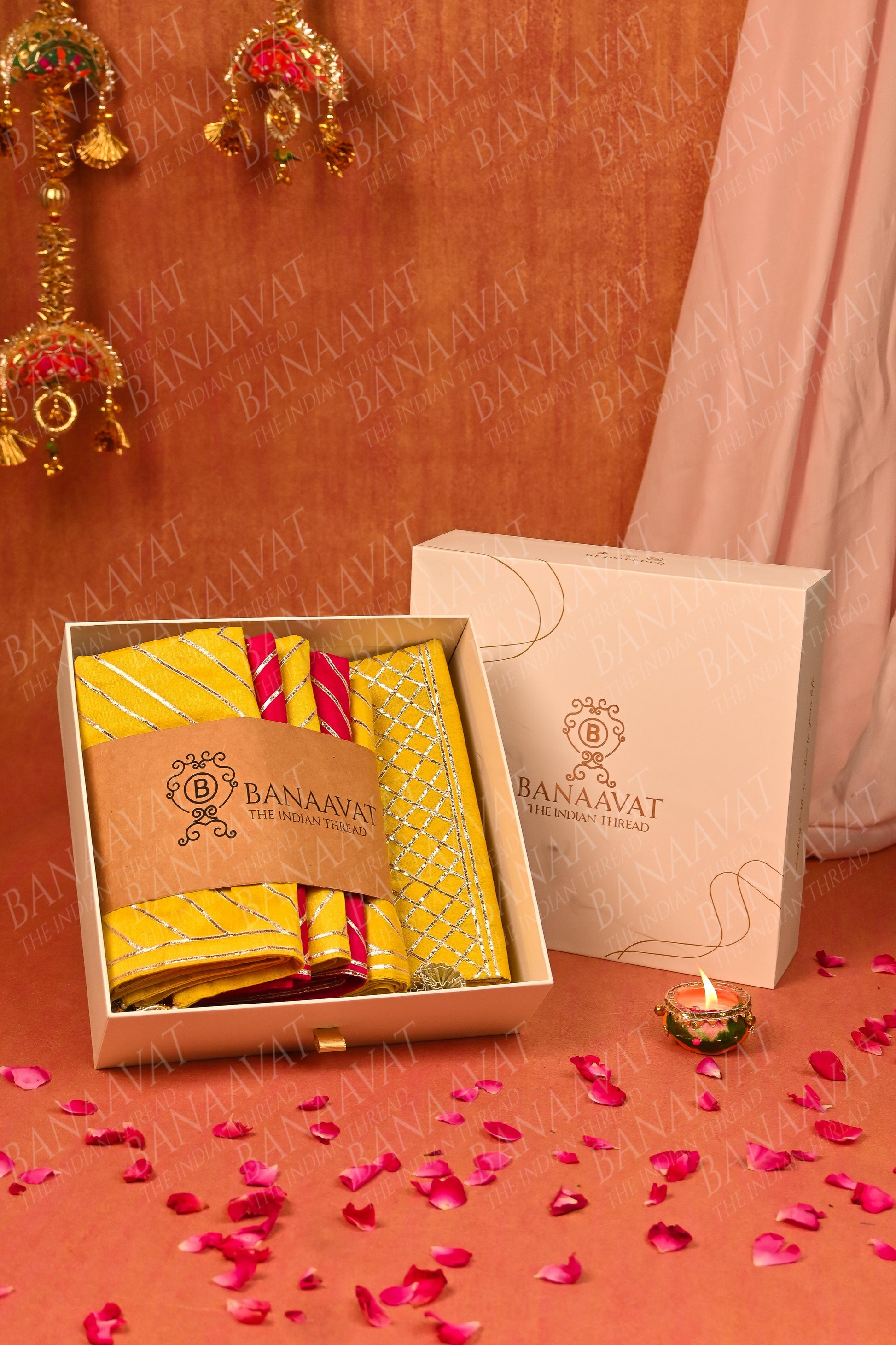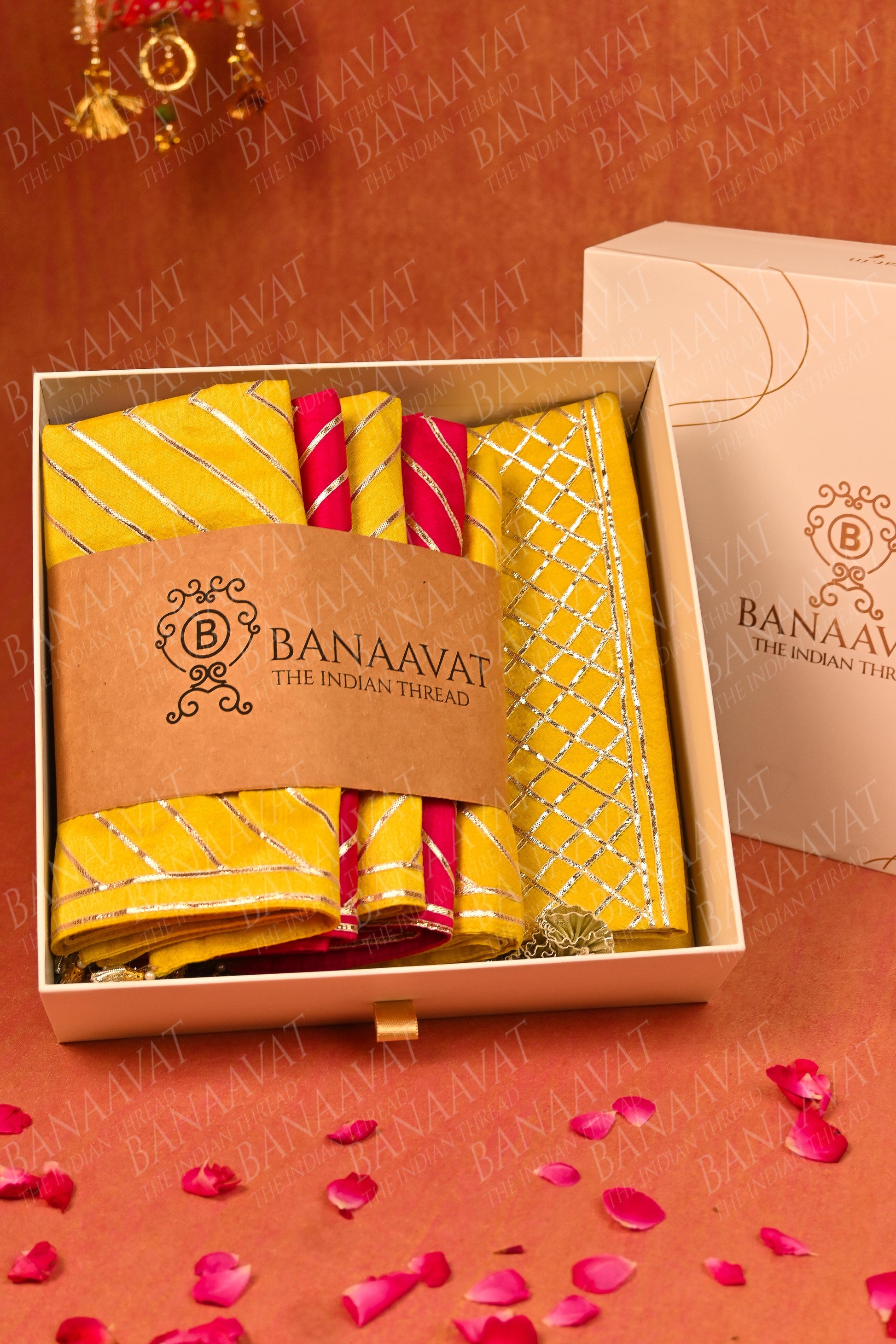 - Set includes: 5 cushion covers (mix of yellow and hot pink color), and 1 red table runner with Gota ribbon work