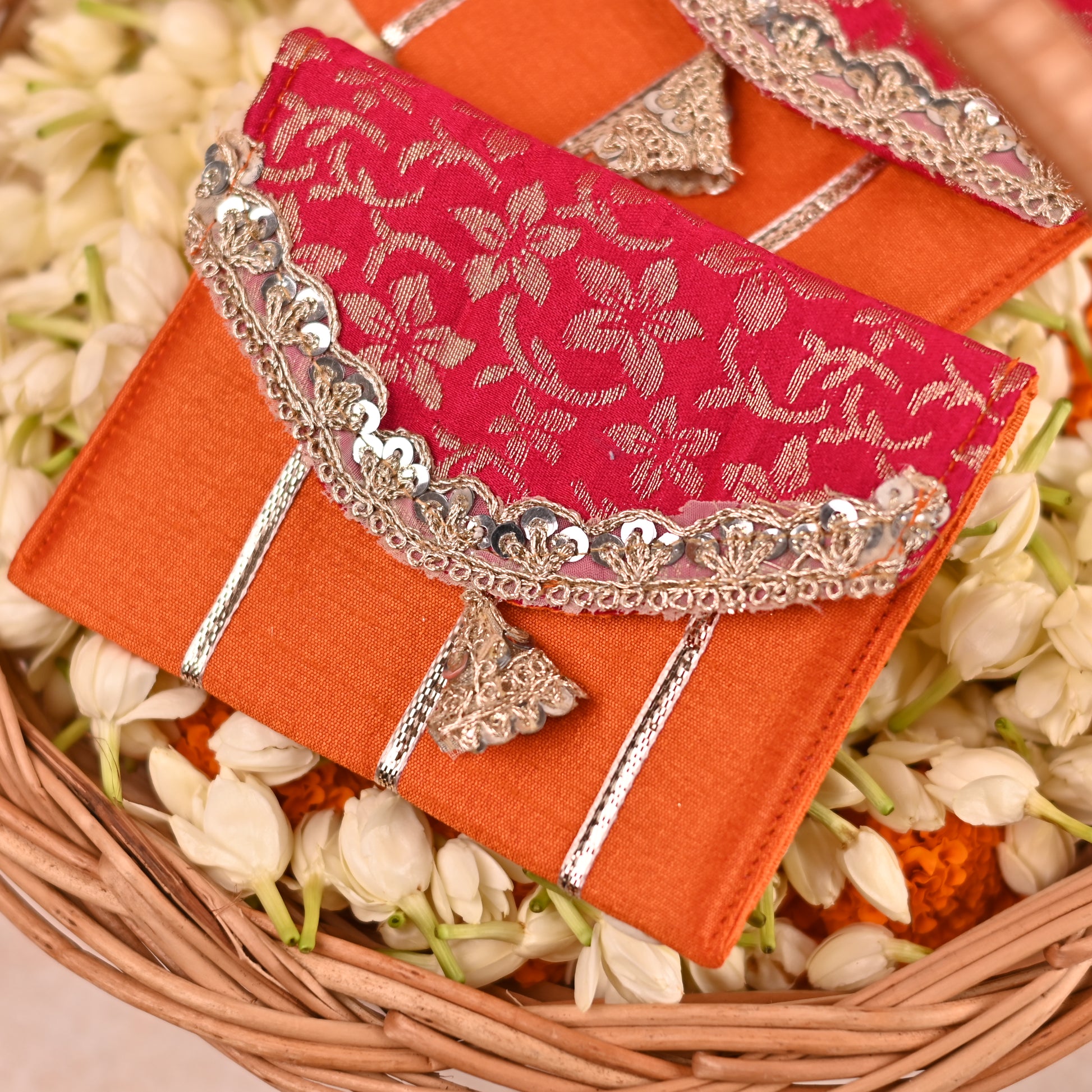 Vibrant hot pink and orange coin pouch from the Gulnar Collection, featuring a luxurious brocade flap. Perfect for adding a bold and festive touch to your wedding gifts and celebrations.