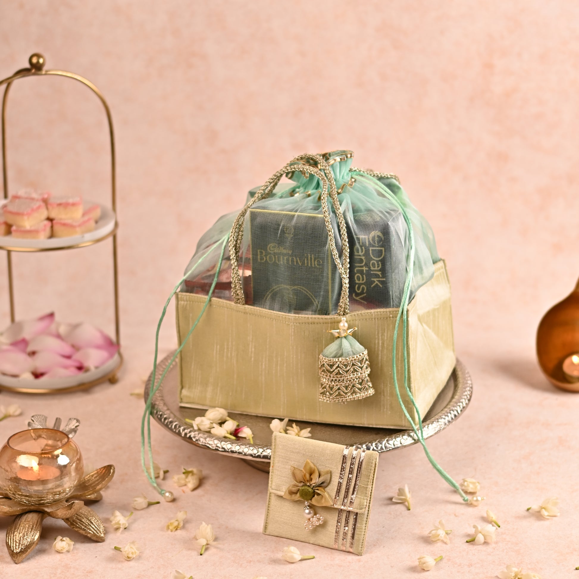 Add a touch of elegance to your return favors with our Pastel Pista Green Potli-Style Hamper Bag. The potli design offers a premium look and is incredibly easy to assemble, making it perfect for curating DIY return favors, welcome hampers, or room hampers for weddings. For complete hamper curation, contact us on Instagram @banaavat.in