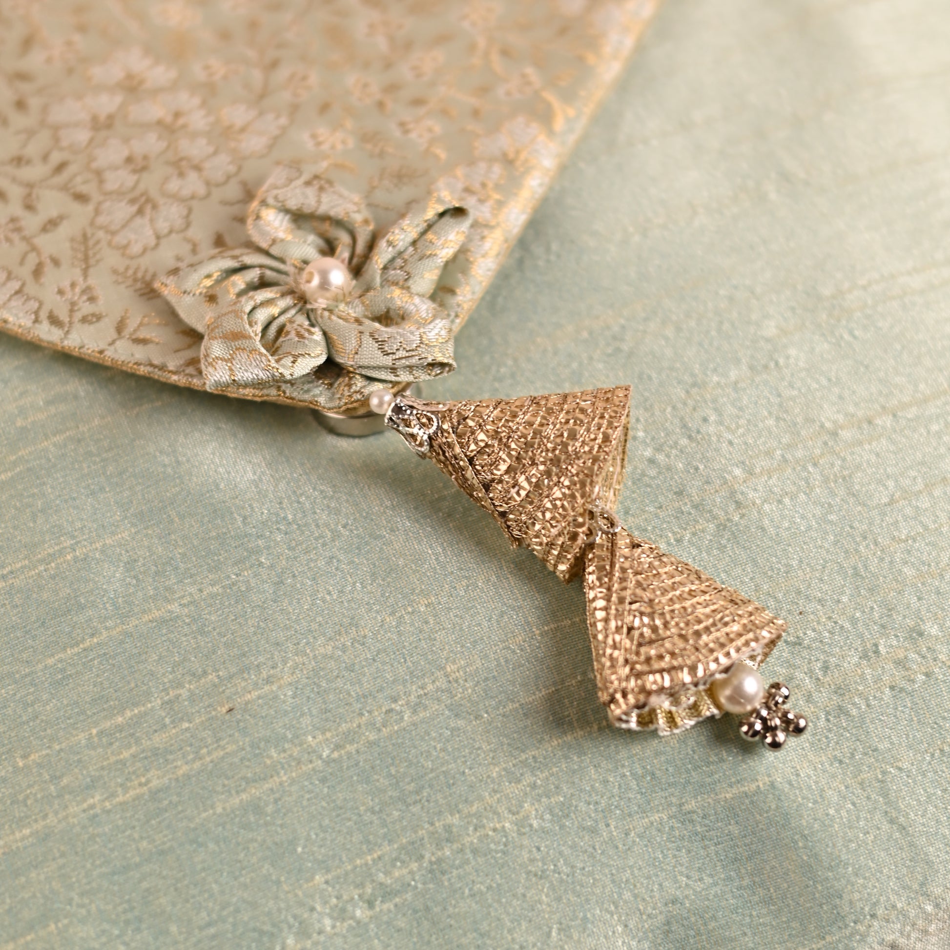 Introducing the Nilasha Collection Set, a beautifully coordinated set of four essential items in a serene pastel sky blue color. This elegant set includes a saree cover, a favor potli, Mini potli and a coin pouch, perfect for adding a touch of sophistication to your storage and gifting needs. Each piece is adorned with exquisite handcrafted brocade flowers, adding a touch of sophistication to your ensemble. Perfect for weddings, festivities, or as a thoughtful gift, this combo is a testament to style and utility in one delightful package.