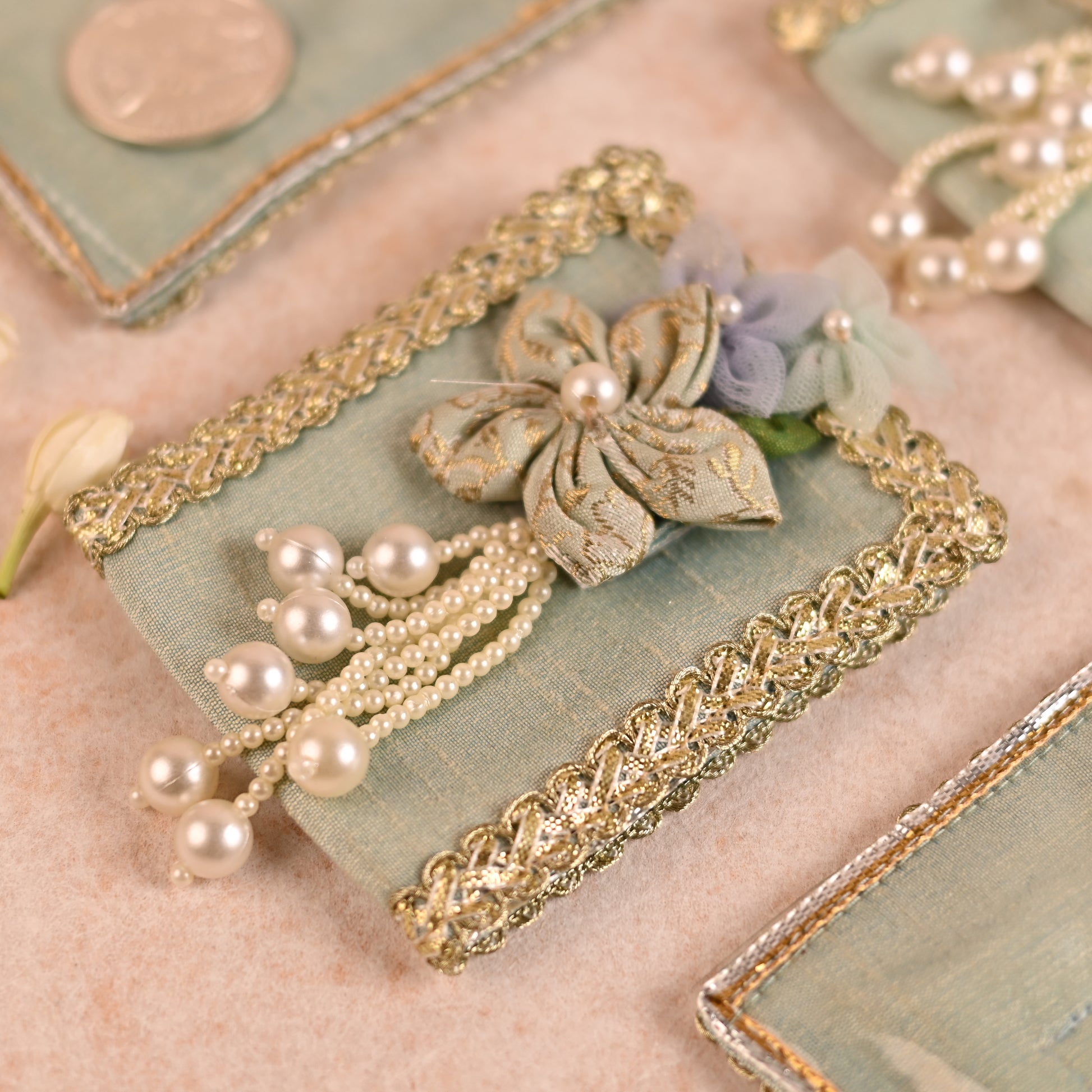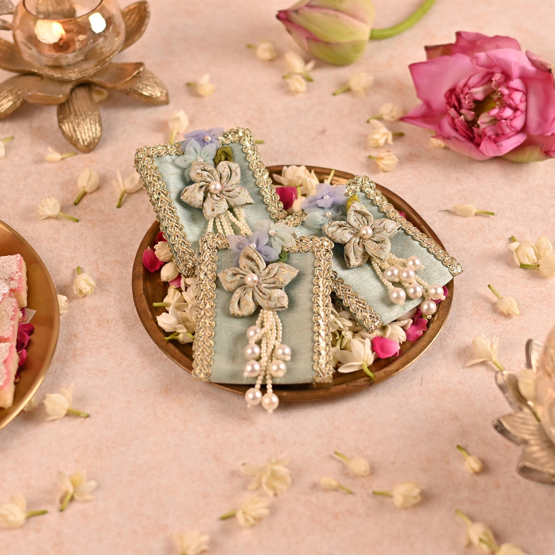 Elegant pastel blue tri-fold holders, designed for coins and ginni. Perfect for a stylish and secure presentation of your wedding gifts and keepsakes.