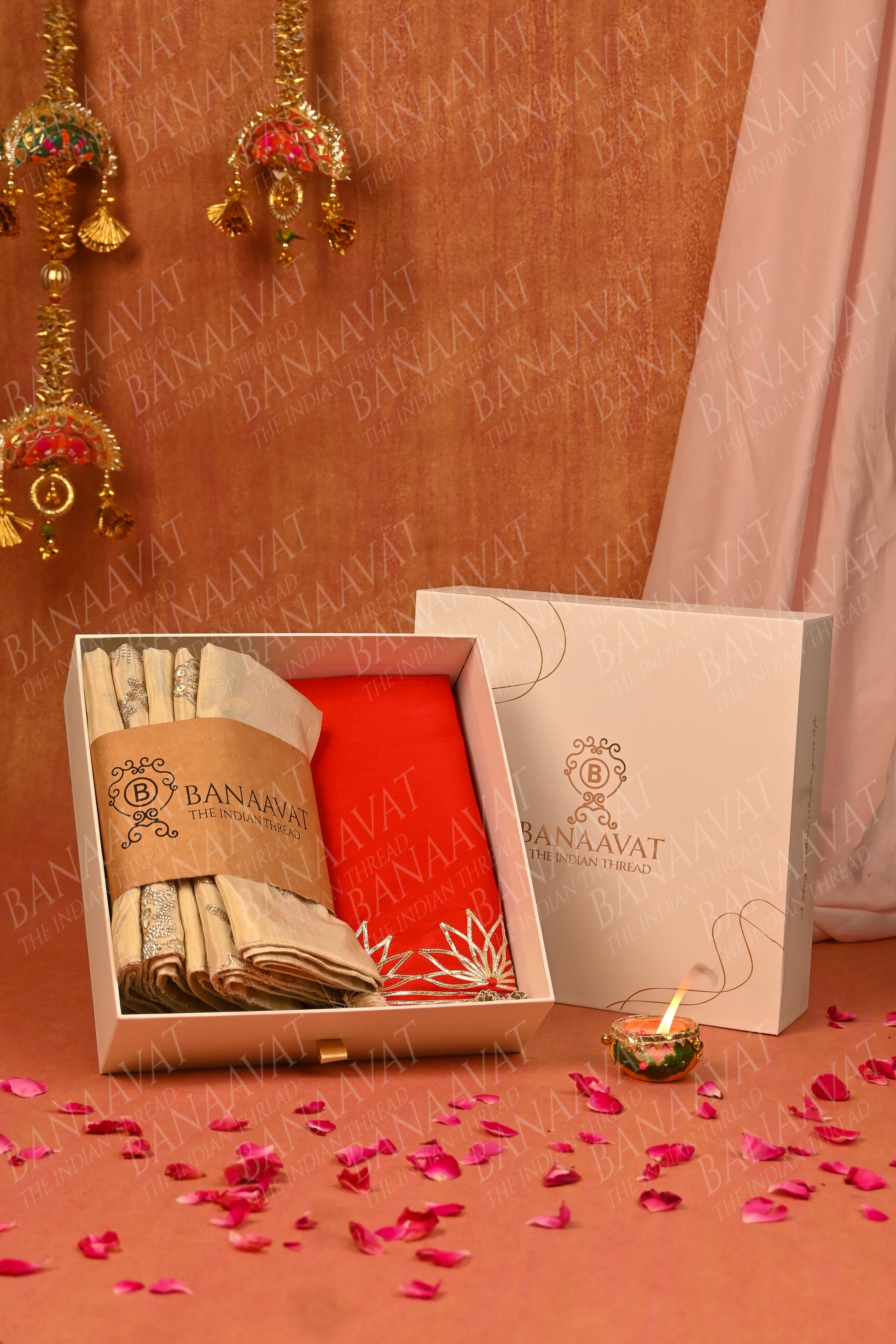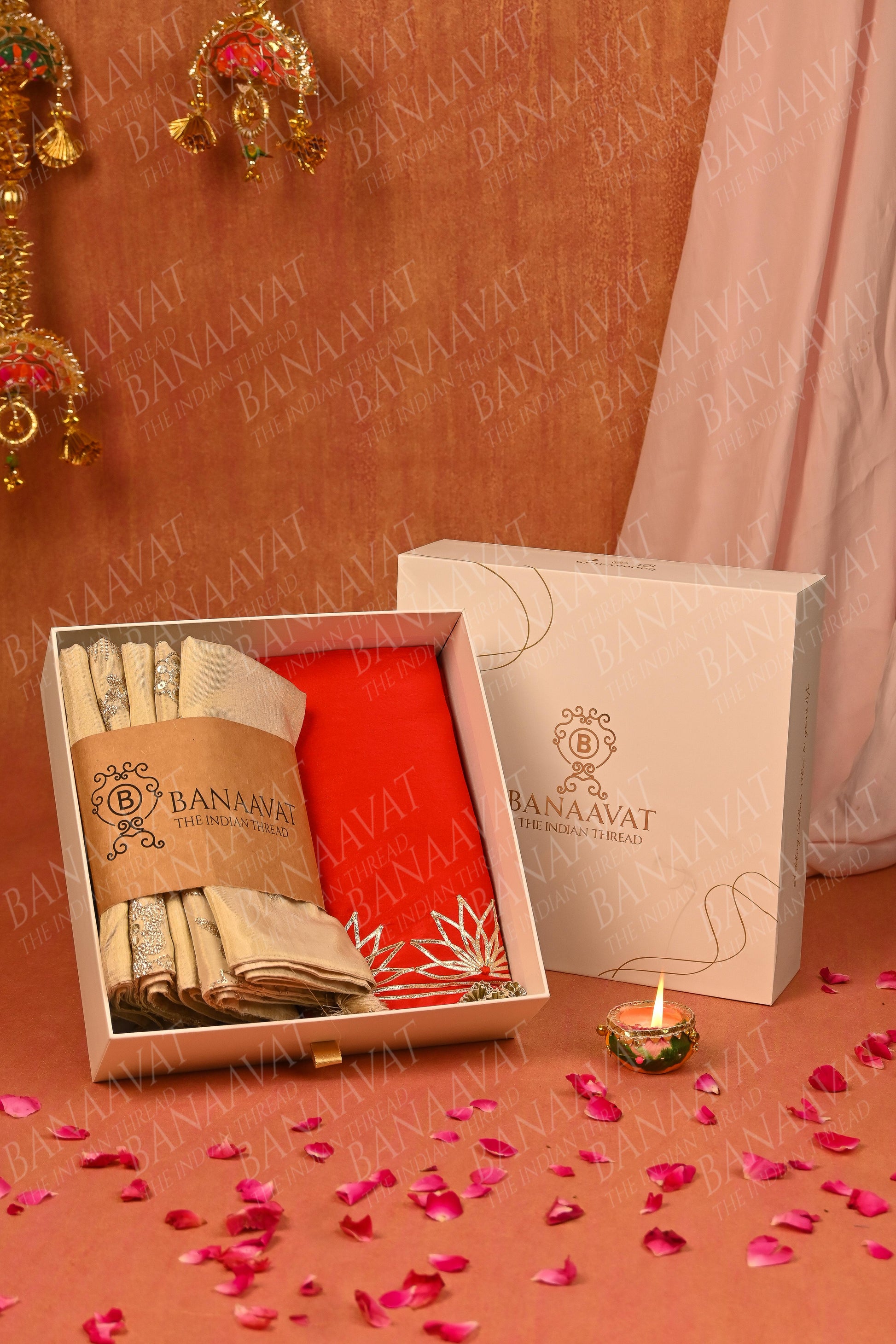 - Set includes: 3 off-white cushions with light embroidery, 2 fully embroidered cushions, and 1 red table runner with Gota ribbon work