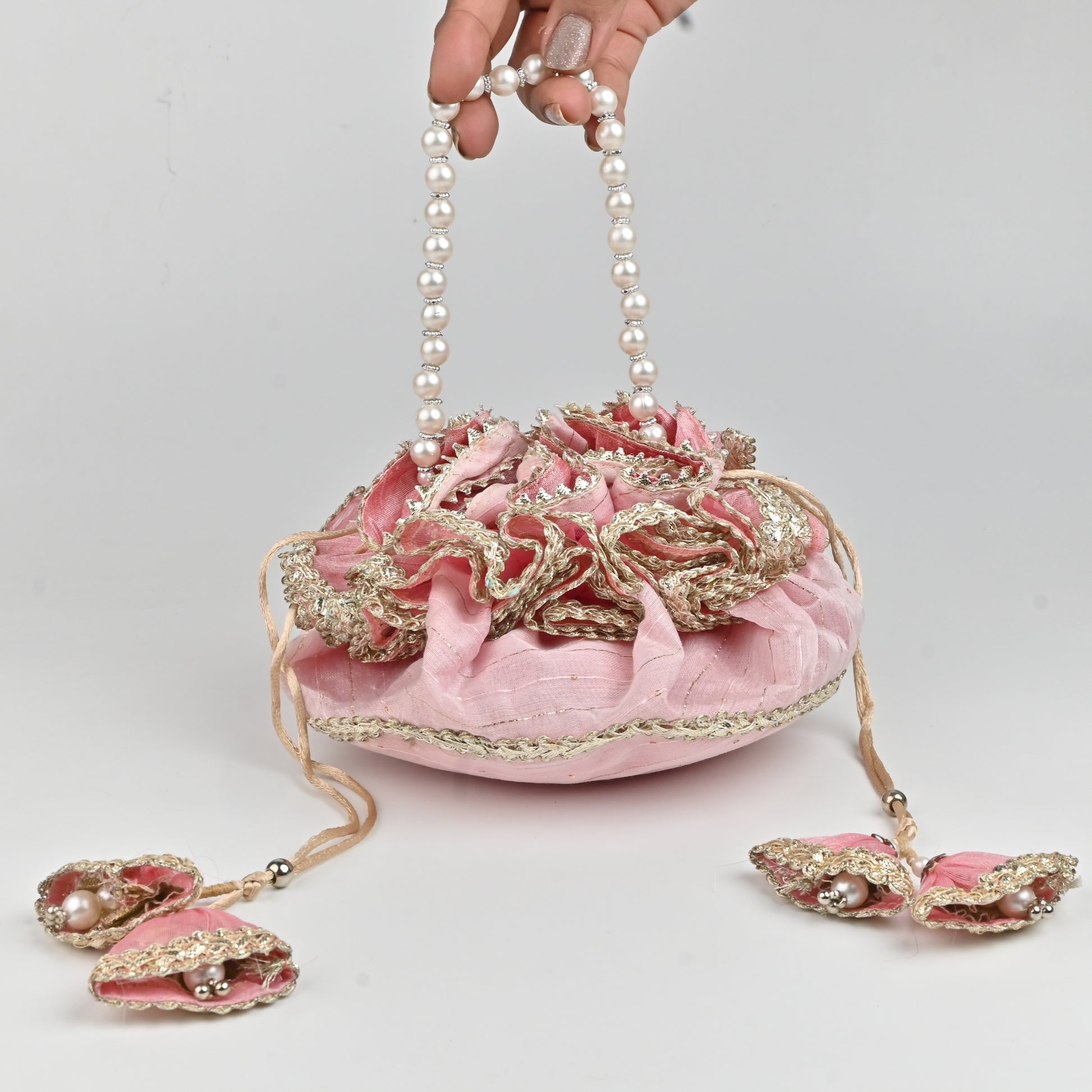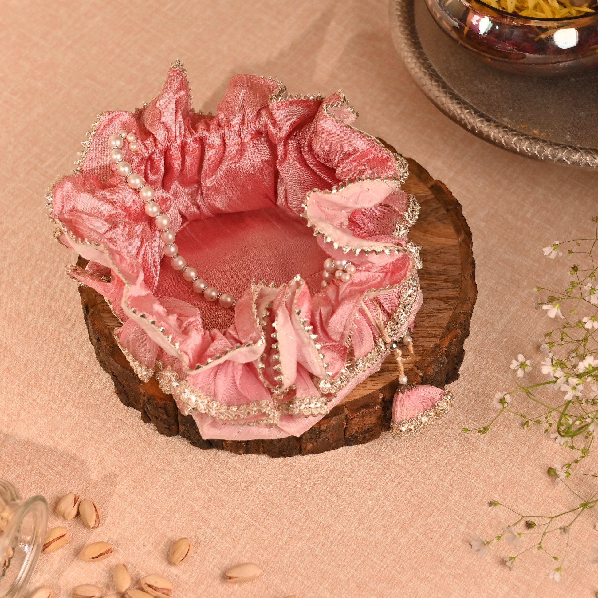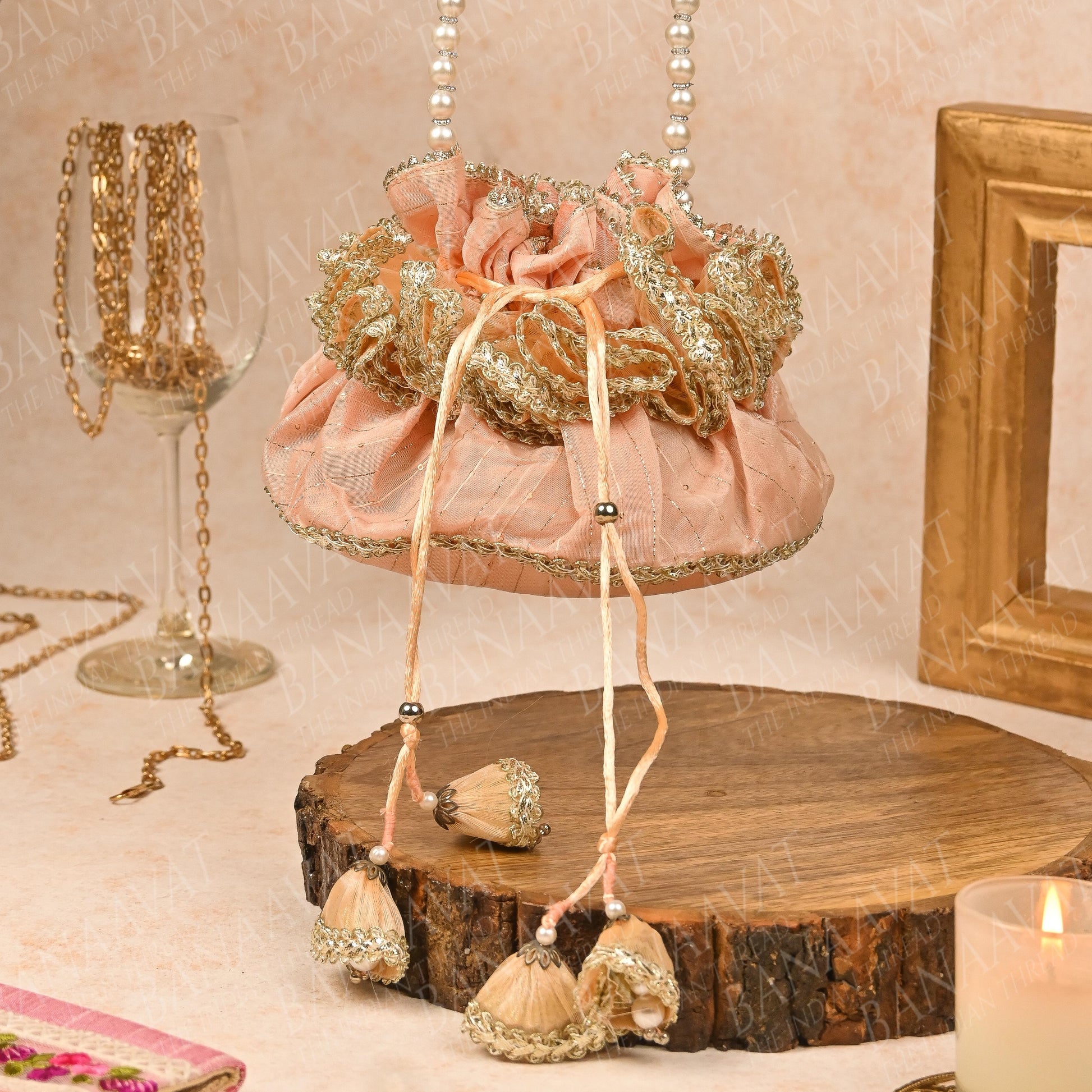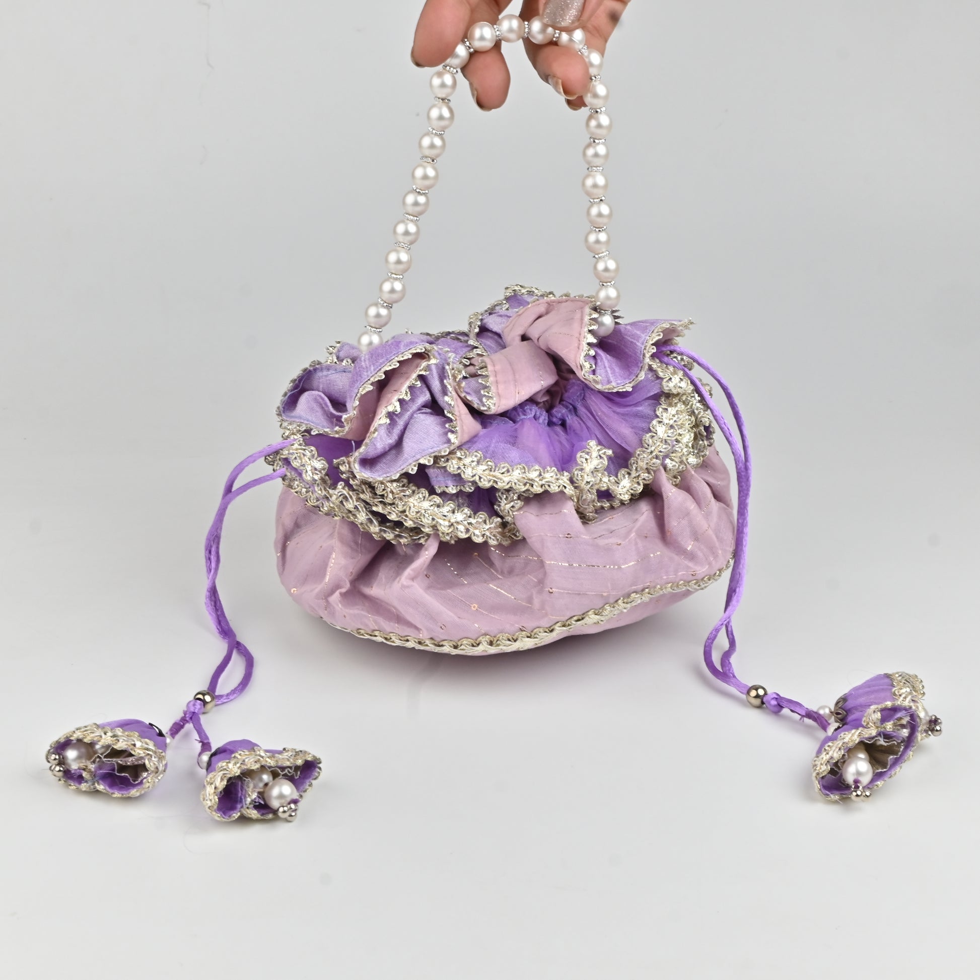 Product Description: Celebrate traditional elegance with our Handi-Inspired Silk Potli from Banaavat Essence. Inspired by the classic design of a traditional Indian handi, this exquisite potli is crafted from premium silk, offering a luxurious texture and refined look. It features a stunning pearl handle that adds a sophisticated accent, while the drawstring is adorned with a handcrafted tassel, showcasing meticulous artisanal craftsmanship. Ideal for weddings, festive occasions, or as a unique gifting accessory, this potli effortlessly blends heritage with contemporary style.